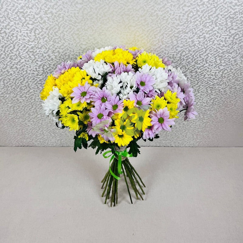 Закажите большой букет из сиреневых, белых, желтых и розовых хризантем и доставка по Ряжску будет бесплатной.